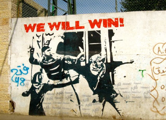 Graffiti vor dem Eingang zum Flüchtlingslager Aida am Ortsrand von Bethlehem im Westjordanland. Aida existiert bereits seit 1948 und dementsprechend wirkt es mehr wie eine Wohnsiedlung denn ein Flüchtlingslager. Rund 5000 Menschen leben hier und alle hoffen noch immer darauf, eines Tages heimzukehren in ihre Dörfer rund um Jerusalem, aus denen sie nach dem israelischen Unabhängigkeitskrieg geflohen sind. Am Eingang zum Flüchtlingslager hängt ein großer Schlüssel, der daran erinnern soll, dass ihnen von den eigenen Häusern rund um Jerusalem nur die Schlüssel blieben.