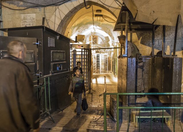 Mitten in der Altstadt von Hebron wurden Checkpoints errichtet, um die rund 500 israelischen Siedler zu schützen. Die Palästinenser wurden von diesem Teil der Stadt im Westjordanland weitgehend vertrieben, ihre Läden einfach verrammelt. Die jüdischen Siedler beanspruchen in Hebron zu leben, da der biblische Stammvater Abraham und seine Frau Sarah hier begraben sein sollen. Auch für die Muslime ist es ein heiliger Ort. Das birgt Konfliktpotential. Die Altstadt ist mittlerweile zu einer Geisterstadt verkommen. Eine Lösung ist nicht in Sicht.