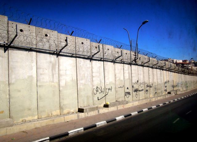 Busfahrt von Ramallah nach Jerusalem: Die Straße führt direkt an der Mauer entlang, mit der sich Israel von dem seit 1967 besetzten Westjordanland abzuschotten versucht. Sie soll vor allem Attentäter abschrecken und den Israelis ein Gefühl von Sicherheit vermitteln, sozusagen ein Bollwerk gegen den Terrorismus.