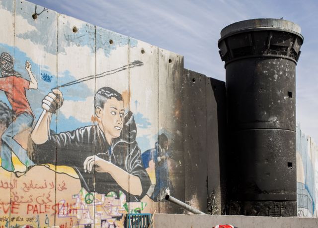 Mauer zwischen Israel und dem palästinensischen Flüchtlingslager Aida in der Nähe von Bethlehem. Der Wachturm ist – auch wenn es nicht so scheint – mit israelischen Soldaten besetzt. (Bilder 1, 2 und 3: Thomas Imo, photothek, GIZ)